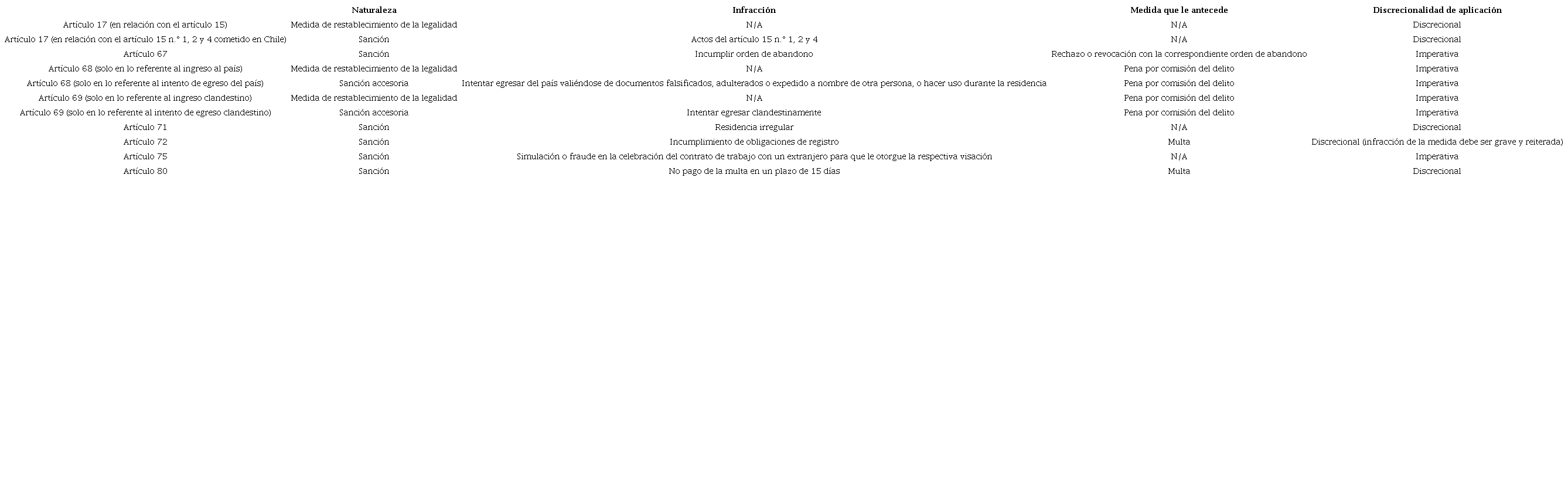 La siguiente tabla da cuenta de los supuestos de expulsión de extranjeros en la LE, así como de su naturaleza jurídica.