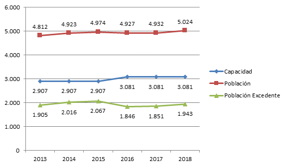 Los resultados de investigación son fruto de un estudio de caso (Flyvbjerg, 2006; Stake, 1978, 1995) conducido en la cárcel La Modelo de la ciudad de Bogotá en el periodo comprendido entre julio y diciembre de 2018. La elección de este establecimiento se justifica por dos razones. En primer lugar, por su importancia política e histórica. La cárcel La Modelo es una de las más grandes del país, con capacidad para 3.081 internos y presenta niveles altos pero estables de hacinamiento (cuadro 1).
