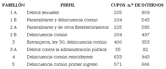 Adicionalmente, este establecimiento concentra gran parte de los esfuerzos de reforma institucional en materia de resocialización que han sido impulsados por las Sentencias T-338 de 2013 y T-762 de 2015 de la Corte Constitucional, que declaran el Estado de Cosas Inconstitucional de las cárceles en Colombia y obligan al gobierno a tomar medidas para mejorar las condiciones de vida de la población penitenciaria y reducir el hacinamiento (Corte Constitucional, 2013 y 2015)1. En segundo lugar, porque la administración de este penal ha implementado un mecanismo de clasificación de los reclusos que combina perfiles delictivos con criterios de ingreso repetido al sistema penitenciario y carcelario. Por ello, la cárcel cuenta con un patio específico para población reincidente por delitos comunes, tal y como se puede observar en el siguiente cuadro: