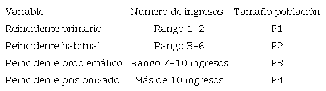 En el curso de la investigación se realizaron 25 entrevistas semiestructuradas, de las cuales 24 fueron a hombres y 1 a una persona perteneciente a la comunidad LGBTI que se identifica como mujer. Teniendo en cuenta que el estudio se dirige a obtener información sobre la percepción de los reincidentes sobre los factores que incidieron en la nueva comisión de un delito, se definió la muestra de personas utilizando como criterio de organización inicial la frecuencia de ingresos al establecimiento. Así las cosas, se clasificó a los entrevistados de acuerdo a su número de ingresos a prisión, con el fin de determinar las diferentes experiencias que presentan diferentes grupos. Para ello, se identificaron como reincidentes primarios, aquellos que presentan 1 o 2 reingresos a prisión; reincidentes habituales a quienes han tenido entre 3 y 6 ingresos; reincidentes problemáticos a quienes han tenido entre 7 y 10 ingresos a prisión; y reincidentes prisionizados a quienes han ingresado más de 10 veces a prisión. De esta forma, antes de la selección muestral la población fue organizada con base en las siguientes variables ordinales: