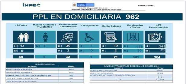 En virtud de lo anterior, el 22 de marzo del 2020 se declaró la emergencia carcelaria en el país7. Es importante anticipar que esta declaratoria no resuelve el problema penitenciario y contiene un reducido alcance frente a aspectos administrativos, dentro de los cuales se encuentra la facultad de hacer uso racional de los medios extraordinarios de coerción y el reclamo del apoyo de la Fuerza Pública para garantizar el orden dentro de las penitenciarías y centros de reclusión del país. Por su parte, el Gobierno Nacional expidió el Decreto legislativo 546 del 14 de abril de 2020, declarado exequible mediante la sentencia C-255 de2020, que adopta medidas para sustituir la pena de prisión y la medida de aseguramiento de detención preventiva en establecimientos penitenciarios y carcelarios por la prisión domiciliaria y la detención domiciliaria transitorias en el lugar de residencia, a favor personas que se encuentran en situación de mayor vulnerabilidad frente al COVID-198. Las restricciones que consagra esta norma jurídica tampoco permiten una apertura significativa como válvula de escape del sistema penitenciario y carcelario colombiano, al punto que para la fecha solo se han beneficiado 945 personas, cuya representatividad es baja frente a la totalidad de la población privada de la libertad. De esta manera se puede afirmar que las críticas9 formuladas en contra de este decreto legislativo fueron acertadas. Eso sí, resulta más alentadora la actividad ejercida por los jueces de ejecución de penas en aplicación de las medidas ordinarias, que han liberado a 14.514 personas y le han sustituido la pena intramural por domiciliaria (artículo 38 del Código Penal) a 11.680 personas.