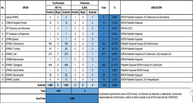 Para mostrar esta problemática en cifras, a continuación, se relacionan los establecimientos de reclusión que tenían confirmados casos positivos de COVID-19 para junio de 2020, así como los fallecimientos de la población privada de la libertad por esta enfermedad.