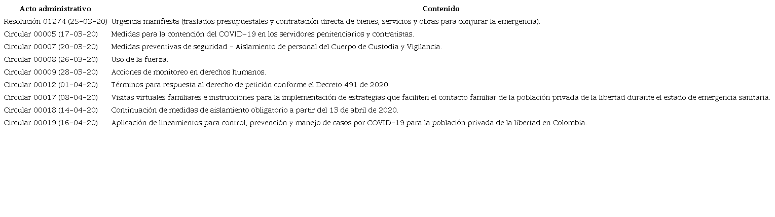 En este punto y con miras a hacer claridad, es importante diferenciar que una cosa es el estado de excepción (Decretos 417 y 617 de 2020) y otra el estado de emergencia penitenciaria y carcelaria (Resolución 001144 de 2020), habilitando el primero, el uso de ciertas facultades legislativas extraordinarias radicadas en cabeza del Presidente de la República (por ejemplo, la expedición del Decreto 546 de 2020) y el segundo, facultades administrativas por parte del director del INPEC21, como se ve reflejado en las medidas relacionadas en la tabla n.º 2.
