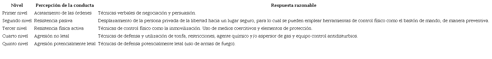 Además, se debe tener en cuenta que, en el marco de los niveles del modelo de uso de la fuerza, se debe analizar la percepción de la conducta de la persona con la que se interactúa, valorando el riesgo y la amenaza (INPEC, 2019)27. En todos los niveles se deben utilizar técnicas verbales, a las que se van acumulando técnicas de control y de defensa, como se observa en la Tabla n.º 3:
