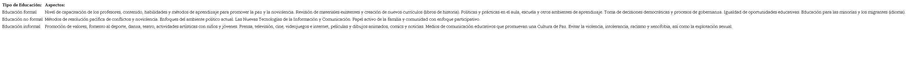 Lo importante de este artículo es mostrar un panorama de lo que implica la paz, la educación y la cultura de paz en una realidad que no pretende ser desalentadora, pero que nos está llamando a ejercer una dinámica totalmente diferente; ya que si bien es cierto se están trabajando con mucho esfuerzo y de manera esperanzadora. El papel del Estado también se está interesando en dicha dinámica y pese a ser un proceso que vislumbra a ser de largo plazo, no quitemos el dedo del renglón para poder ver el día de mañana resultados.