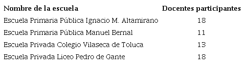 Datos relevantes acerca de los sujetos de investigación: decidimos realizar este ejercicio de trabajo de campo con docentes que ejercen como tal, en la Escuela Primaria Ignacio M. Altamirano, C.C.T 15DPR1182E, turno matutino, con una matrícula de 18 docentes, situada en la localidad de Santiaguito Tlalcilalcalli, municipio de Almoloya de Juárez y la Escuela Primaria Manuel Bernal, C.C.T 15DPR2470D, turno vespertino, con una matrícula de 11 docentes, ubicada en la localidad de Santiaguito Tlalcilalcalli, municipio de Almoloya de Juárez; ambas de carácter público y el Colegio Vilaseca de Toluca, C.C.T 15PS0139H, turno matutino, sección primaria, con una matrícula de 13 docentes, ubicada en Corregidor Gutiérrez 103 Col. La Merced, Toluca, Estado de México, y el Liceo Pedro de Gante, con una matrícula de 18 docentes, sección primaria localizada en Rinconada de Pino Suárez, 102, Col. 5 de Mayo Toluca de Lerdo, Estado de México, ambas de carácter privado. Por lo que se muestra en el cuadro No. 2, de manera gráfica, las escuelas que se trabajaron, así como los docentes que apoyaron para tal investigación.