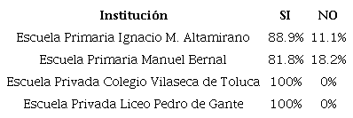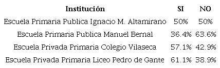 Los docentes de la escuela primaria pública trabajan valores como el respeto, la solidaridad y la tolerancia. Esto con respecto a la necesidad de los alumnos ya que mencionaban los docentes, que tristemente existe una reproducción de lo que pasa en el ámbito familiar, en la mayoría de las ocasiones. El respeto que se manifiesta a los docentes por parte de los alumnos es visible en las escuelas privadas (84% en el Liceo y el 43% en la Vilaseca), a diferencia de las escuelas públicas que manifiestan entre un 40% en la Altamirano y 37% en la Manuel Bernal. Mientras que en el factor casi siempre estas mismas escuelas reflejan un 16% en el Liceo y un 57% en la Vilaseca, y las escuelas públicas el porcentaje se incrementa entre el 60% y 63% respectivamente. Lo que en general se observa es que existe más control y respeto en las escuelas privadas.