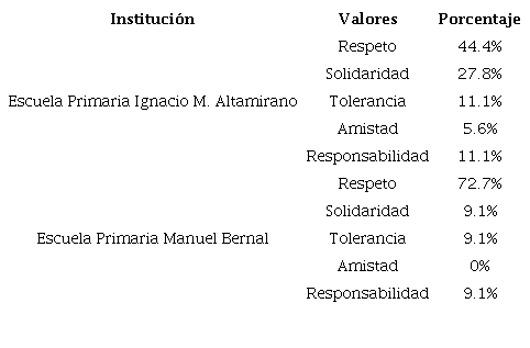 Los valores que se trabajan son muy similares y sin duda se le da más peso al respeto, dándole cabida a más valores como solidaridad, tolerancia y responsabilidad. El valor de la amistad no se trabaja en la escuela Manuel Bernal, y en la escuela Ignacio M. Altamirano se lo hace de manera incipiente.