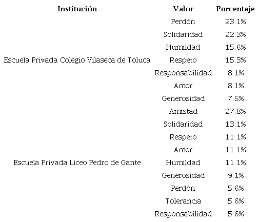 Por otro lado, se encuentran los valores trabajados por los docentes de la es- cuela privada, como respeto, tolerancia, igualdad, humildad, perdón y amor, entre otros. Resulta interesante ver los últimos tres valores por la naturaleza del Colegio Vilaseca de Toluca, que está bajo la tutela de las hermanas josefinas, quienes creen firmemente en una filosofía de educación integral en la cual el ambiente debe ser el propicio para desarrollar este fin; por eso dan mucho énfasis al perdón y el amor, como parte de la filosofía de la no-violencia.