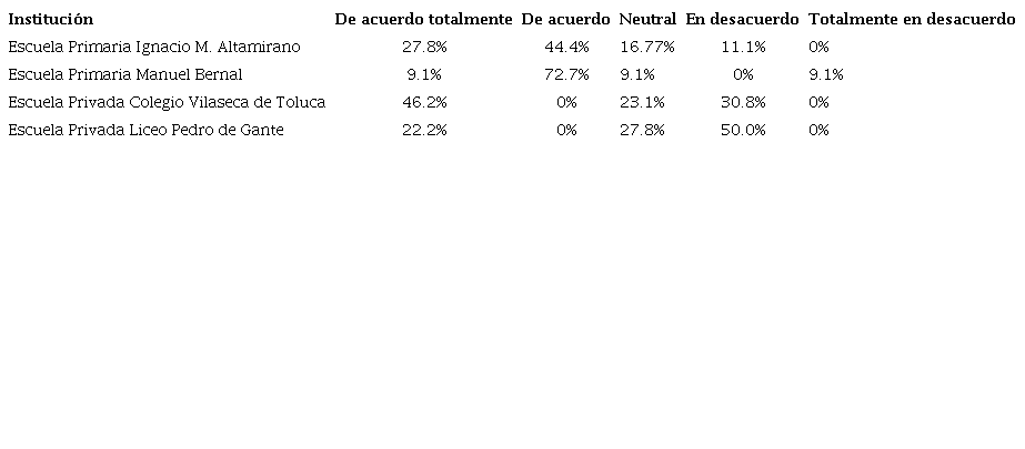 También se muestra que tanto el porcentaje de los docentes consideran que son el factor principal en la educación del alumno al menos para la enseñanza y clarificación de los valores como se puede visualizar a continuación. Señalando que el 46.2% de los docentes del Colegio Vilaseca de Toluca está de acuerdo con que el papel del docente es un factor elemental para la educación y formación de los alumnos; mientras que 50.0% de los docentes del Liceo Pedro de Gante está en desacuerdo con dicho papel.