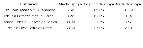 Las escuelas públicas ubicadas en el municipio de Almoloya de Juárez mues- tran cómo pese a estar en una comunidad con familias nucleares, la relevancia del apoyo y la familia se refleja en el poco apoyo que muestran los alumnos y que los docentes logran percibir; sin embargo, es valioso decir que el docente se empeña en hacer un buen trabajo forjando los pocos o muchos valores adquiridos en casa, así como en el contexto en el que se desarrolla; así mismo, trabaja para inculcarlos de manera permanente para ser practicados y se vean reflejados en acciones futuras. En el siguiente cuadro, se muestra el apoyo de los padres para la complementación de los valores de los alumnos, en las escuelas públicas que fueron parte de la investigación, observando esto: