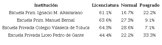 Las escuelas públicas muestran un mayor porcentaje de licenciatura como formación de sus docentes manifestando un 61.1% y un 63.6% ante un 64.3% de los docentes con esta misma formación de la escuela Vilaseca frente a un 44.4% del colegio Liceo Pedro de Gante; sin embargo, el 33.3% de sus profesores de esa misma escuela tienen el nivel de posgrado más alto, a diferencia del 7.1% de los de la escuela Vilaseca con este grado de estudios.