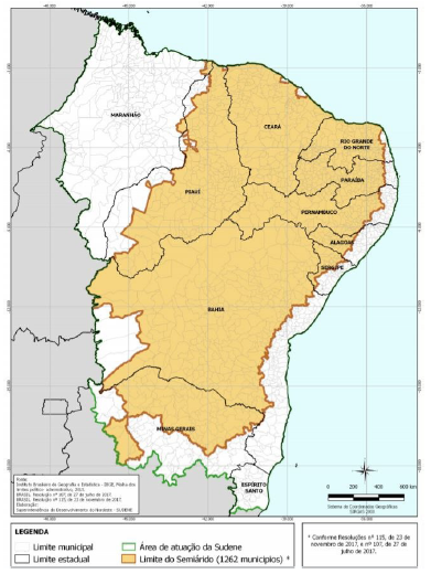 De acordo com a Resolução nº 115, de 23/11/2017, do Ministério da Integração Nacional e Superintendência do Desenvolvimento do Nordeste (SUDENE), o Semiárido brasileiro é composto por 1.262 municípios, dos estados do Maranhão, Piauí, Ceará, Rio Grande do Norte, Paraíba, Pernambuco, Alagoas, Sergipe, Bahia e Minas Gerais. A Figura 2 apresenta o recorte geográfico indicado nesta Resolução (SUDENE, 2017).