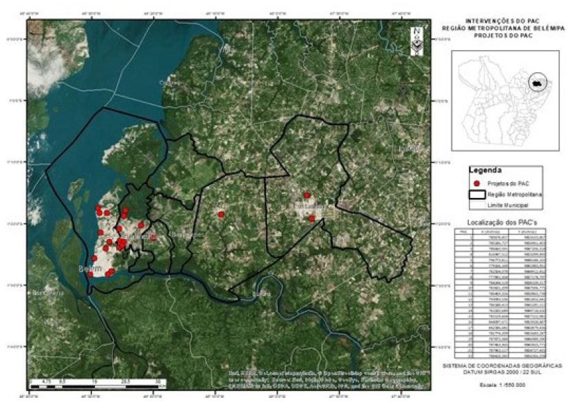 Desde 2007, foram realizados, pelo Governo do Estado do Pará e pelas prefeituras de algumas cidades abrangidas pelo PAC, na modalidade UAP, investimentos públicos que contemplam prioritariamente famílias de baixa renda com implementação de infraestrutura urbana e produção de unidades habitacionais (UH). A Figura 1 destaca as intervenções do PAC-UAP na RMB até o ano de 2016.