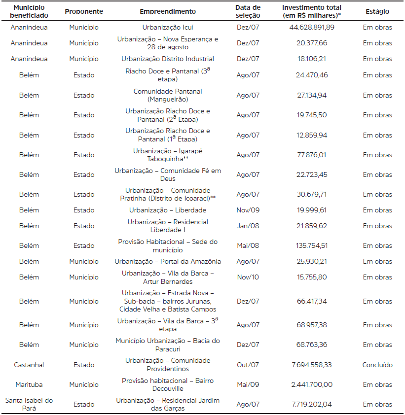 Segundo dados do Ministério do Planejamento Orçamento e Gestão (MPOG) de 2016, os projetos PAC-UAP, na RMB, estavam majoritariamente localizados em Belém: 15 projetos iniciados, dos quais 10 contratados pelo Governo do Estado do Pará e 5 pela Prefeitura Municipal de Belém (PMB). Deste total, havia, em dezembro de 2017, 6 projetos atrasados, 5 paralisados, 4 contratados (mas não iniciados) e, ainda, nenhum finalizado. O total previsto é de 7.476 unidades. O município de Ananindeua possui 3 projetos do PAC-UAP iniciados, todos contratados pela Prefeitura, prevendo-se a construção de 730 unidades, porém os projetos estavam paralisados (MPOG, 2016). A Tabela 1 lista as obras em Urbanização de Assentamentos Precários nos municípios de Ananindeua e Belém.
