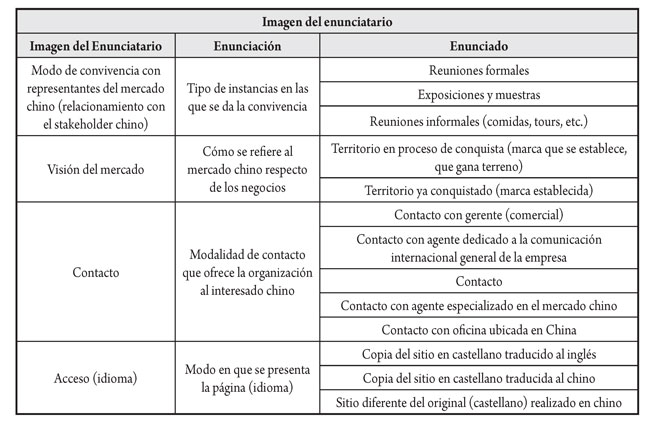 La tabla 4 enseña las categorías de análisis de cómo la organización crea una imagen del enunciatario, los stakeholders chinos (enunciatarios, recipientes de la comunicación).
