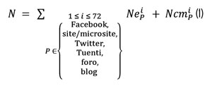 el número de comentarios publicados por los CM en los distintos recursos web (P) para el i número de ficciones que integra la muestra. Asimismo, recordemos que Ne