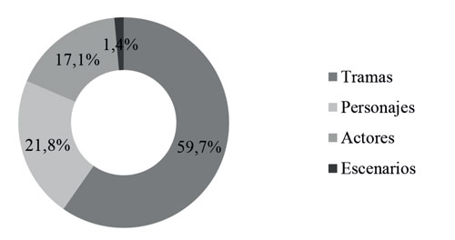 El 62.6 % (5073posts) del total de comentarios (8103 posts) hacen referencia al mundo narrativo, que comprende las tramas (3028 posts), los personajes (1104 posts), los actores (869 posts) y los escenarios (72 posts).