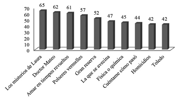 Finalmente, el 50 % (5 programas) de las 10 ficciones con más comentarios positivos sobre la trama pertenecen al drama, mientras que el 70 % (7 programas) centran sus historias en la actualidad. El share7 determina relativamente el sentimiento positivo de la audiencia social, pues solo cuatro de las ficciones con más comentarios positivos sobre la trama se sitúan en el top 10 del ranking de audiencia, esto es, Cuéntame cómo pasó (23.6 % de share), Amar en tiempos revueltos (21.4 % de share), La que se avecina (19.4 % de share) y Gran reserva (18.4 % de share). Águila Roja, la ficción más vista en 2011 y 2012 en el ámbito estatal (29.5 % de share) ocupa el decimonoveno puesto en la clasificación de referencias positivas con 30 posts, mientras que Los misterios de Laura, cuyas tramas generaron más sentimiento positivo, obtuvo el 16.6 % de share. Por cadenas, el 40 % fueron emitidas en La 1 y el 30 % en Antena 3 (figura 3).