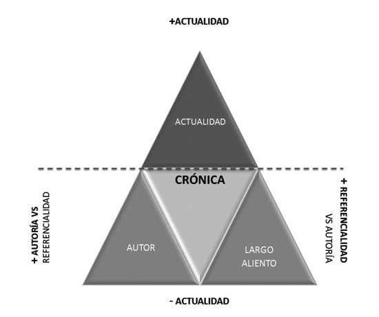 En el segundo de los vértices, se situaría la crónica de actualidad, un género que en cierta manera se ha desdibujado en el periodismo de algunos países latinoamericanos, pero con una identidad sólida en el ámbito español (desde las crónicas deportivas a las de corresponsal, pasando por las parlamentarias), destinada a ofrecer la interpretación del acontecer inmediato, por parte de un cronista-testigo que dispone de la cualificación-especialización en un ámbito temático o geográfico, que le otorga autoridad para sustentar su análisis. En este caso, la escritura tiene una importancia sustancial, pero está supeditada al relato y la interpretación de unos hechos recientes, lo cual influye en su alcance.