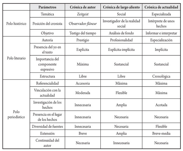 Atendiendo a los tres marcos que han modelado la identidad de la crónica como concepto plural, "categoría trigénica" (Carrera, 2016), se ha optado por situar en un eje vertical los tres polos de influencia (histórico, literario y periodístico) con diferentes parámetros explicativos, extraídos de las características que les han atribuido los autores referenciados. De este modo, se pretende definir la variedad de matices que caracterizan a los tres tipos de producciones identificadas como crónica (tabla 1).