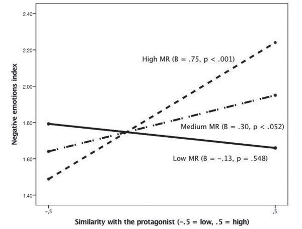 The third hypothesis posited that the effect of similarity on identification would be conditioned by the previous level of prejudice the participants felt towards immigrants. In this context, modern racism has been pointed out in previous studies as a relevant variable for understanding intergroup relations (McConahay et al., 1981) and the process of reception and impact of fictional feature-length movies in which significant examples of relations between characters pertaining to ethnic or cultural minorities and characters of the ingroup are shown (Eno & Ewoldsen, 2010; Igartua & Frutos, 2017). The results show that modern racism (taken as a measure of prejudice towards immigrants) did not condition identification. However, two significant results were indeed obtained in this context: first, that the individuals with a higher level of modern racism identified less with the protagonist of the narrative (regardless of her nationality); and second, that modern racism moderated the relation between similarity and negative emotions.