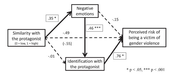 The result of the mediational analysis is consistent with those obtained in the study by Hoeken and Sinkeldam (2014), even though these authors postulated an inverse sequence (and in their study, they did not manipulate similarity but rather the attractiveness of the character). In the present study, it is evident that a highly intense dramatic narrative (showing examples of incidents of physical abuse) immediately provokes negative emotions, which can lead spectators to identify with and put themselves in the place of the victim. Given the dramatic nature of the scenes shown in the video, it is logical that identification is not a requirement for producing emotional impact; rather, the latter takes place as an automatic process. Once the spectators have put themselves in the protagonist's shoes, it is logical to expect their risk or vulnerability perception to increase. In this regard, a previous study showed that identification with the main characters of a TV series that broached the consequences of an undesired teenage pregnancy increased the audience's risk perception and this in turn stimulated a higher behavioral intention to prevent pregnancy (Moyer-Gusé & Nabi, 2010). Thus, the findings of our study are consistent with the idea that people are susceptible to attitudes shown by characters in narratives (de Graaf et al., 2012). It can be confirmed that the process is posited as follows: If the protagonist of a narrative is perceived as similar, a cognitive-emotional connection with that character takes place more easily; this will cause the opinions, beliefs and attitudes of the character to have a greater impact on the audience, because when people identify with a character, they are more likely to take on the character's point ofview than when that connection does not exist.