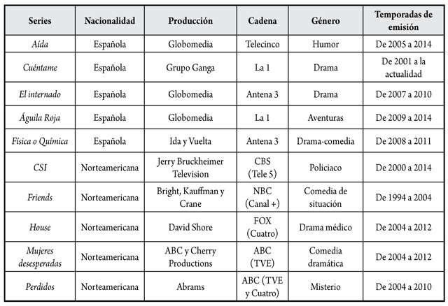Para la realización del estudio, se eligieron diez series de televisión, cinco de ellas españolas y cinco norteamericanas. El principal criterio de elección fueron sus altos índices de audiencia y su emisión en varias temporadas, lo que facilita la familiaridad del espectador con ellas y el índice de recuerdo. En la tabla 1, se presentan los datos de cada una de las series. Como puede verse, en las cinco series norteamericanas, figura la cadena en la que fueron emitidas originalmente, y entre paréntesis, la cadena de televisión española en la que fueron programadas. El dato de temporadas de emisión muestra cómo todas ellas se han emitido a lo largo de varias temporadas, por lo que la probabilidad de exposición de los espectadores ha sido alta.