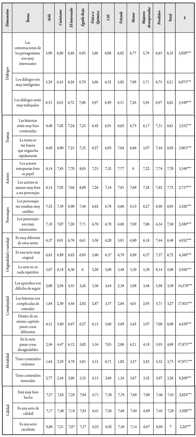 En la tabla 2, se analizan también si las diferencias entre las series al considerar las distintas dimensiones son estadísticamente significativas. Como puede verse, los resultados del análisis de la varianza indican que se encuentran diferencias significativas al 99 % en las valoraciones de todos los ítems analizados. Las mayores diferencias, no obstante, se encuentran en los ítems que evalúan las dimensiones originalidad y variedad y, especialmente, en complejidad y moralidad. Las creencias de los espectadores es que estos aspectos difieren mucho de unas series a otras.