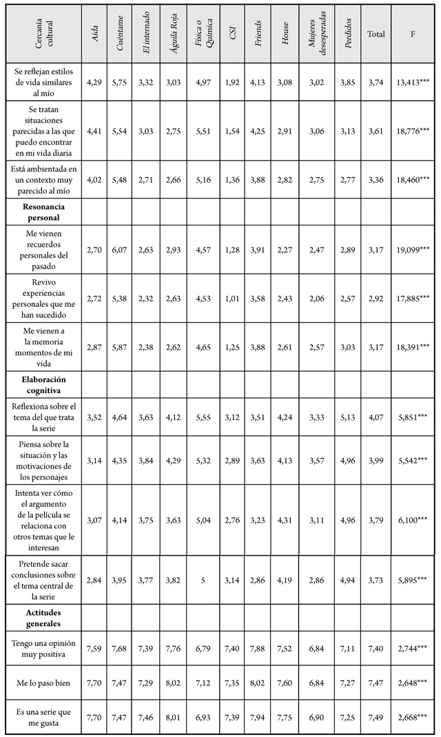 La cercanía cultural se ha medido con tres ítems: “Se reflejan estilos de vida similares al mío”, “Se tratan situaciones parecidas a las que puedo encontrar en mi vida diaria” y “La serie está ambientada en un contexto muy parecido al mío”. La media de estos tres ítems en el caso de las series elegidas es de 3,57, aunque existen importantes diferencias entre ellas. Las series que mayor cercanía tienen son Cuéntame y Física o Química, ambas españolas, lo que concuerda con el resultado obtenido en Lacalle (2012). Las que menos cercanía tienen son CSI y Águila Roja, lo cual significa que los espectadores perciben estas series como lejanas culturalmente a ellos. Especialmente baja es la puntuación del ítem “Está ambientada en un contexto muy parecido al mío”. En relación con este aspecto, debemos destacar la puntuación obtenida por Friends. A pesar de tratarse de una serie americana, los espectadores españoles perciben que es casi tan cercana culturalmente como una serie local tan costumbrista como Aída. Esto confirma para el conjunto de la población el resultado obtenido por Grandío (2007b) para una muestra fundamentalmente juvenil, justificado por la familiaridad de los espectadores con el género de la comedia de situación y el acostumbramiento a las series norteamericanas.