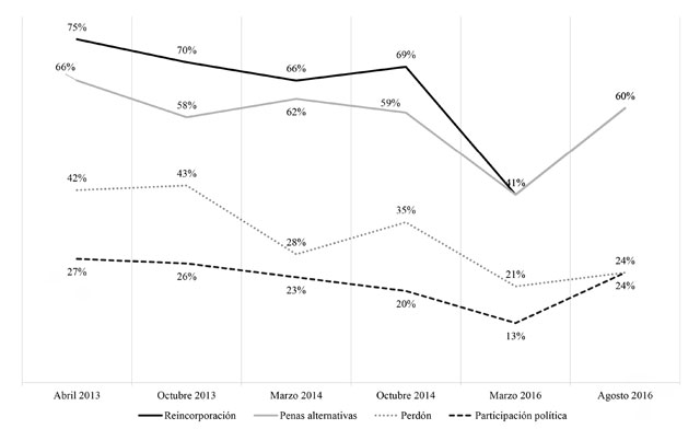 En cuanto a las preguntas atinentes a la posibilidad de la reincorporación a la vida civil de los desmovilizados y la alternatividad penal, los consultados expresaron posiciones más flexibles en indicadores que iniciaron con altos porcentajes (el 75 y el 66 %, respectivamente) y que concluyeron con un 60 % de respaldo ciudadano (Gómez y Cárdenas, 2017, p. 169).