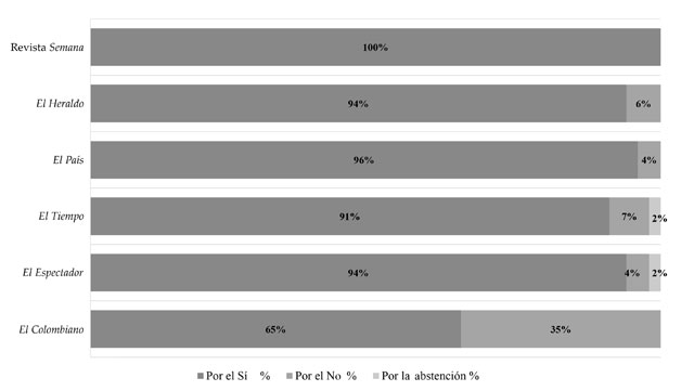La prensa de referencia en un 54 % de los artículos publicados sobre el plebiscito tomó una posición (a favor del Sí o a favor del No), y cuando así se evidenció, la posición adoptada fue a favor del Sí (en 216 piezas). Cuando el medio asumió una posición editorial, lo hizo de manera mayoritaria a favor del Sí (El Tiempo, El Espectador, El País y El Heraldo), excepto El Colombiano, que no asumió postura desde sus editoriales, y Semana que no publica editoriales; sin embargo, todos sus columnistas respaldaron el Sí. Esta postura de editorialistas y columnistas no coincidió con lo expresado por los ciudadanos en las urnas, quienes privilegiaron el No a la pregunta de la convocatoria, y lleva a un análisis preliminar que pone de relieve “la inocuidad o la irrelevancia de las consignas editoriales” (Amón, 2016).