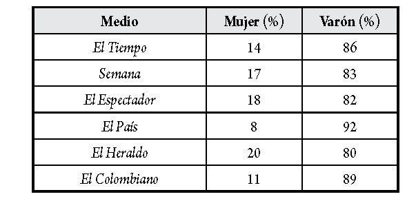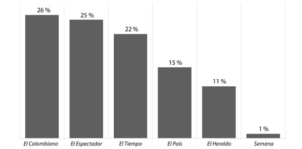 A este respecto, y como se aprecia en la tabla 4, el comportamiento de los periódicos fue diverso. Por ejemplo, El Heraldo destinó mayor espacio a la opinión femenina (20 %) con columnistas como Tatiana Dangond, Cecilia López Montaño, Lola Salcedo, Claudia Ayola, Mónica Gontovnik, Catalina Ruiz Navarro y Bertha C. Ramos; El Espectador (17 %) publicó artículos de Catalina Ruiz Navarro, Ana Milena Muñoz de Gaviria, Melba Escobar, Aura Lucía Mera, Piedad Bonnett, Tatiana Acevedo, Claudia Morales, Cecilia Orozco Tascón, Cristina de la Torre, Yolanda Ruiz, Elisabeth Ungar, María Paula Saffón, Viviam Newman y Patricia Lara Salive; El Tiempo (14 %) contó con colaboraciones de María Isabel Rueda, Cecilia López Montaño, Adriana La Rotta, Margarita Rosa de Francisco, Cecilia Álvarez Correa, Socorro Ramírez, Laura Gil, Claudia López, Catalina Cock D. y Lucy Nieto de Samper; El Colombiano (11 %) tuvo el aporte de colaboradoras habituales como Ana Cristina Aristizábal Uribe, Cristina de Toro, Martha Lucía Ramírez, Ana Cristina Restrepo Jiménez, María Clara Ospina, Elbacé Restrepo y Enoris Restrepo de Martínez; y por último, El País (8 %) publicó piezas de opinión escritas por Melba Escobar, Patricia Lara Salive, María Elvira Bonilla, Carolina Toledo Patterson, Paola Andrea Gómez, Beatriz López, Ángela Cuevas de Dolmetsca, Gloria H. y Aura Lucía Mera.