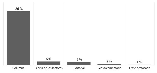 Como se observa en la figura 4, la columna fue el subgénero de opinión que registró mayor frecuencia de uso para expresar la opinión sobre el plebiscito, con un 86 % del total de las piezas publicadas. Cabe destacar también que los lectores pudieron expresar su opinión (cartas de los lectores) que alcanzaron un segundo lugar con un 6 % de las piezas, mientras que la institucionalidad de la prensa desde sus editoriales ocupó el tercer puesto, con el 5 % del total de las piezas de opinión publicadas.