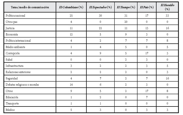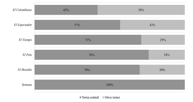 En consonancia con el nivel de importancia otorgado por la prensa nacional al plebiscito, se observó que, en la mayoría de las piezas publicadas, este fue asumido como el tema central, conducta de Semana y El País, El Heraldo, El Tiempo y El Espectador, excepto de El Colombiano que priorizó otros, aunque asociados al mecanismo refrendatorio. Es preciso señalar que la opinión publicada entendió el plebiscito como un tema relacionado prioritariamente con la política nacional (28 %), seguido de la justicia (14 %), los debates religiosos y morales (8 %) y la economía (8 %). El primero resulta normal porque se entiende el plebiscito como un mecanismo de participación en política para el constituyente primario; el segundo, justicia, se presta para interpretaciones contradictorias, podría entenderse en sentido positivo, pero podría leerse también en sentido negativo, injusticia, asunto que debe investigarse mucho más a fondo y que queda como un debe para posteriores estudios.