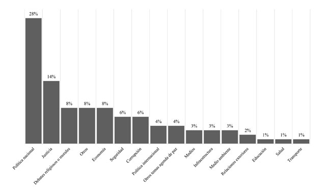 También se estudió la manera en que la opinión publicada relacionó el plebiscito con otros temas de la actualidad nacional (figura 8). Estos resultados asocian el tema, de manera lógica y esperada, con asuntos de política nacional (28 %). Pero llama la atención que en la segunda mayor frecuencia sea relacionado con el tema justicia (14 %), asunto que ha presentado el mayor grado de dificultad a la hora de su reglamentación en la legislatura del posacuerdo en el Congreso.