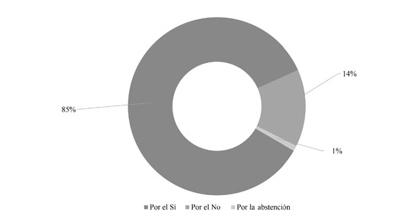 En la figura 9, se observa que, de las 235 piezas de opinión en las que se apreció una postura, en 216 (85 %) la posición fue por el Sí, en 35 piezas (14 %) por el No y el 1 % argumentó a favor de la abstención. Estos son resultados de las cifras relativas del presente estudio; pero, cuando se observan las cifras absolutas, esas 216 piezas en las que sus autores invitaron a votar por el Sí, alcanzan el 46 % del total de piezas publicadas sobre el plebiscito, en tanto que el No solo llegó al 7,5 % del universo de piezas estudiadas.