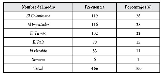 El Observatorio de Medios recogió todas las piezas de opinión publicadas en los diarios y las revistas de referencia8 durante los cuarenta días previos a la refrendación, es decir, desde el 24 de agosto de 2016 (día de cierre de las negociaciones entre delegados del Gobierno de Colombia y las FARC) hasta el día de la votación en las urnas. En total, Siglo Data MMI suministró a los investigadores9 un universo compuesto por 466 piezas de opinión, distribuidas con la siguiente frecuencia y participación según el medio (tabla 1).
