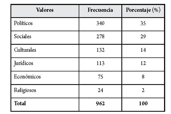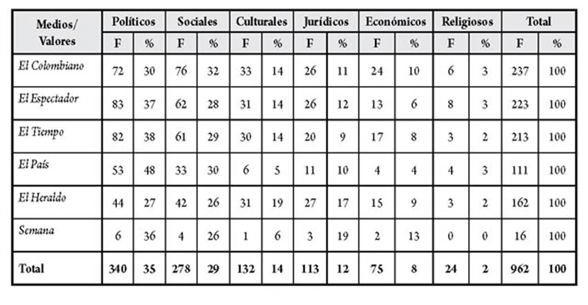 Los resultados obtenidos en la medición de esta variable y contenidos en la tabla 12 nos permiten concluir que El Colombiano privilegió la argumentación sustentada en valores sociales, mientras que los demás medios escritos (El Espectador, El Tiempo, El País, El Heraldo y Semana) sustentaron sus argumentos en valores políticos.