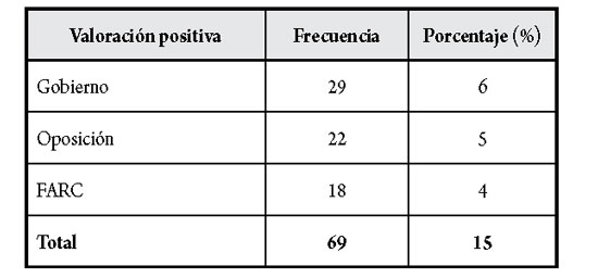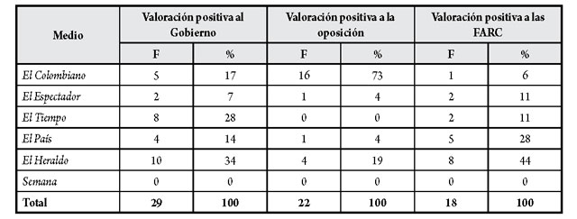 Según los datos obtenidos en el estudio y presentados en la tabla 14, el medio que hizo más valoraciones positivas sobre el Gobierno fue El Heraldo: 10, para un 34 %; seguido de El Tiempo: 8, para el 28 %. El Colombiano fue el periódico que mayor número de valoraciones positivas hizo sobre la oposición con 16, para un 73 %. Por último, El Heraldo fue el medio que mayor número de valoraciones positivas hizo sobre las FARC con 8 (44 %), seguido de El País con 5, para un 28 %.