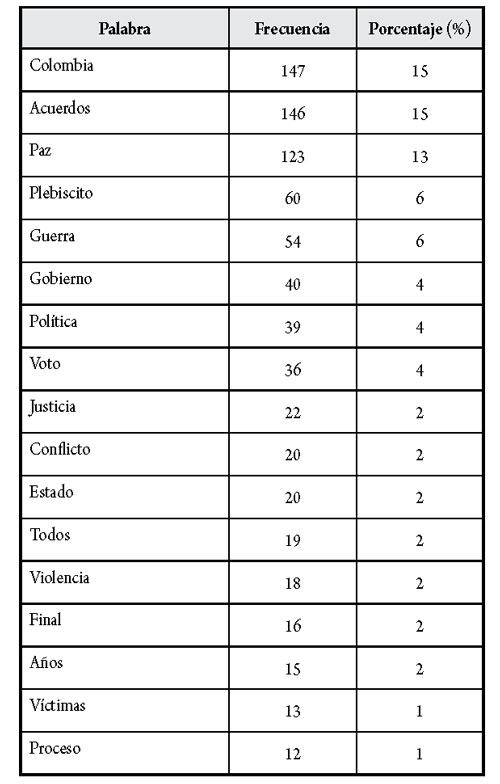La medición de la frecuencia de las palabras más usadas en los textos de opinión publicados por la prensa colombiana sobre el plebiscito muestra, primero, el uso de palabras como “Colombia”, “acuerdos” y “paz” (con un promedio de 138 veces) que parecieran indicar el objetivo; segundo, palabras como “plebiscito”, “guerra”, “Gobierno”, “política” y “voto” (promedio de 45) que explican lo ocurrido; y tercero, palabras que indicarían posiciones como “justicia”, “conflicto”, “Estado”, “todos”, “violencia”, “final” y “años” (en promedio 18). En contraposición, la palabra “víctimas”, categoría protagonista del proceso de negociación, solo es usada 13 veces.