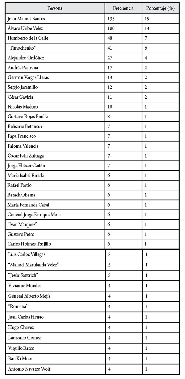 Los actores políticos del proceso de paz, llámese Gobierno y oposición, tuvieron la más alta frecuencia de aparición en secciones de opinión de la prensa colombiana, el presidente Juan Manuel Santos y el expresidente y actual senador Álvaro Uribe Vélez, asunto que indica la preocupación de los medios por ofrecer a las audiencias equilibrio respecto de las posiciones a favor y en contra del plebiscito del 2 de octubre de 2016. En el ranking de aparición de nombres de personas en los artículos estudiados, aparecen los negociadores del proceso de paz Humberto de la Calle (jefe de la comisión del Gobierno) y Timochenko (jefe de las FARC). En tercer grado de frecuencia, aparecen diversos personajes de la política nacional e internacional con algún nivel de injerencia en el proceso colombiano.