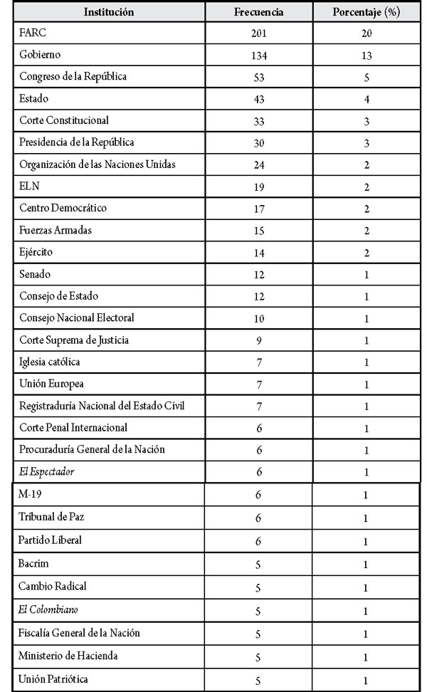 Primero, por el alto número de menciones, aparecen los actores del proceso de negociación en La Habana: el Estado colombiano (aquí se agrupan las menciones a Gobierno, Estado, Presidencia de la República y Ministerio de Hacienda), con 212 menciones, seguido de las FARC con 201 menciones. Segundo, aparecen instituciones representativas de los otros poderes del Estado, como Congreso y Senado, con 65 menciones; Corte Constitucional, Consejo de Estado, Corte Suprema de Justicia y Fiscalía General de la Nación, con 59 menciones; algunos organismos internacionales que tienen alta relación con el proceso de paz, como la Organización de las Naciones Unidas (ONU), la Unión Europea (UE) y la Corte Penal Internacional, con 37 referencias directas; algunos partidos políticos, como el Centro Democrático, el Partido Liberal, Cambio Radical y la Unión Patriótica, con 33 menciones; organismos de seguridad del Estado, como las Fuerzas Armadas y el Ejército, con 29 menciones; otros órganos de control estatal, como el Consejo Nacional Electoral, la Registraduría Nacional del Estado Civil y la Procuraduría General de la Nación, con 23 menciones; fueron referidos también dos medios de comunicación, El Espectador y El Colombiano, con citas de autorreferenciación 11 veces, y la Iglesia católica fue mencionada en 7 oportunidades.