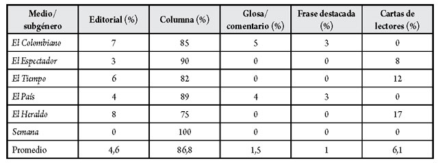 La revista y los cinco periódicos analizados tuvieron comportamientos diferentes al definir el subgénero de opinión para expresar sus posiciones respecto del plebiscito. Por ejemplo, dos periódicos regionales (El Heraldo y El Colombiano) fueron los que más editoriales publicaron sobre este mecanismo de participación ciudadana con el 8 y 7 % en su orden, según se aprecia en la tabla 2, mientras que El Espectador solo publicó el 3 % del total de los editoriales. Semana y este último diario privilegiaron las columnas con el 100 y el 90 %, respectivamente.