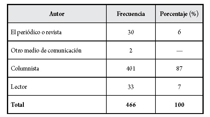 Otro elemento clave que permite calibrar la importancia que se otorga a la opinión que se expresa tiene que ver con asumir la responsabilidad de los contenidos difundidos: la prensa asume esta responsabilidad a través de los editoriales, en las columnas la asume quien firma y, en el caso de los lectores, cuando estos envían la correspondencia a la dirección de los periódicos con nombre y firma (Gómez et al., 2010).