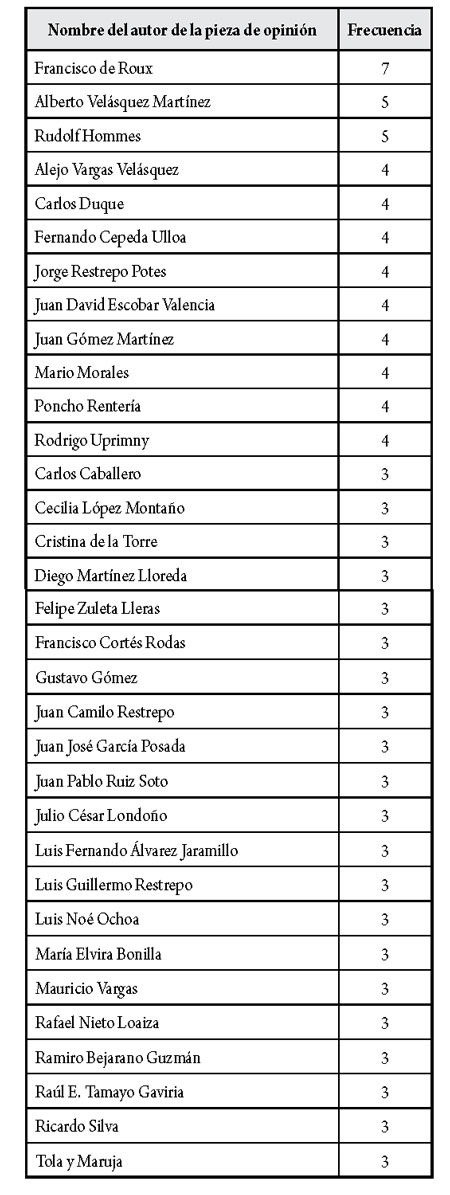 En la tabla 5, se incluyen los columnistas que publicaron tres o más piezas de opinión, frecuencia que significó un registro superior al 1 %. El listado está encabezado por el sacerdote jesuita Francisco de Roux, columnista de El Tiempo (“La Paz desde la ética de lo neutral”, “Mi voto”, “El perdón increíble”, “Vamos por el ser humano” y “Un voto ante la vida”) y El Colombiano (“Voto en conciencia” y “Domingo del plebiscito”) con siete publicaciones; seguido del exdirector de El Colombiano, economista y diplomático Alberto Velásquez Martínez con cinco columnas (“Maniqueísmo clerical”, “Estalló la paz”, Bájense de la nube”, “Dictadura constitucional” y “La astucia presidencial”); y por Rudolf Hommes, exministro de Hacienda y columnista de El Tiempo (“En el lugar del otro” y “Los imparciales”), El Colombiano (“La paz y la reforma tributaria”), El Heraldo (“Paz y reforma tributaria”) y El País (“¿Qué sigue?”) también con cinco columnas. Solo tres mujeres aparecen entre los 33 columnistas con mayor frecuencia de publicación: Cecilia López Montaño en El Heraldo (“No demos reversa” y “Digan lo que digan”) y en El Tiempo (“¿Cómo se financiaría el posconflicto?”); Cristina de la Torre, de El Espectador (“Partidos a reinventarse”, “Impunidad de cuello blanco” y “¿Ocaso del lenguaje traqueto?”); y María Elvira Bonilla de El País (“El coco de la justicia”, “Usted sabe que nos va a matar” y “Santos, un paso al costado”).