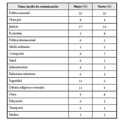 En la tabla 8, se observa que las mujeres relacionaron el plebiscito con temas de política nacional (25 %), justicia (17 %), debates religiosos o morales y seguridad (11 %). Los varones plantearon la misma prioridad temática, pero con porcentajes diferentes: política nacional (25 %), justicia (14 %) y debates religiosos o morales (9 %).