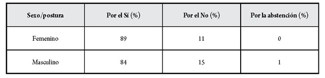 La posición asumida según el sexo marca una pequeña diferencia; las mujeres que publican sus opiniones en la prensa presentaron mayor inclinación a favor del Sí (89 %) que los hombres (84 %) (tabla 9).