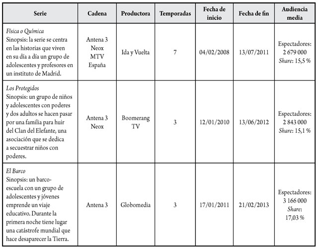 En el caso español, se sigue esta misma lógica. Las tres teen series seleccionadas para el estudio de audiencia (Física o Química, 2008-2011; Los Protegidos, 2010-2012; El Barco, 2011-2013) tienen como protagonistas a adolescentes, y presentan en sus tramas los dilemas y las preocupaciones usuales en esta etapa, como es la búsqueda de la identidad, las primeras relaciones amorosas y sexuales, etc.