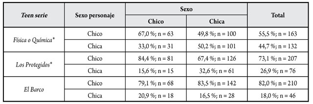 Los personajes favoritos son tanto chicos como chicas,1 pero los porcentajes varían dependiendo de la teen serie analizada. En Física o Química, el 55,4 % (n = 164) son personajes masculinos y el 44,6 % (n = 132) femeninos. En Los Protegidos, el porcentaje de personajes masculinos (73,2 %; n = 208) es muy superior al de femeninos (26,8 %; n = 76). Más acentuada es la diferencia en el caso de El Barco, en que el 82,1 % (n = 211) de los personajes escogidos son masculinos y únicamente el 17,9 % (n = 46) son femeninos. Con esto, observamos que los personajes masculinos tienen una acogida mayor que los femeninos y, por tanto, devienen un punto de referencia más común y atractivo.